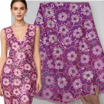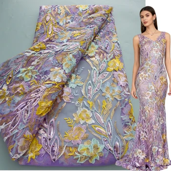 4607 Elegance Purple High Quality African Lace Fabric for Weddings Party Woven Fashion Embroidery Beaded Mesh Sequin Lace Fabric