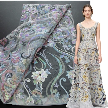 4593 New Design Floral Embroidery Pearl Lace Dress Fabric Shiny Sequin Beaded Net Fabric Beads Lace Fabric for Party Dress