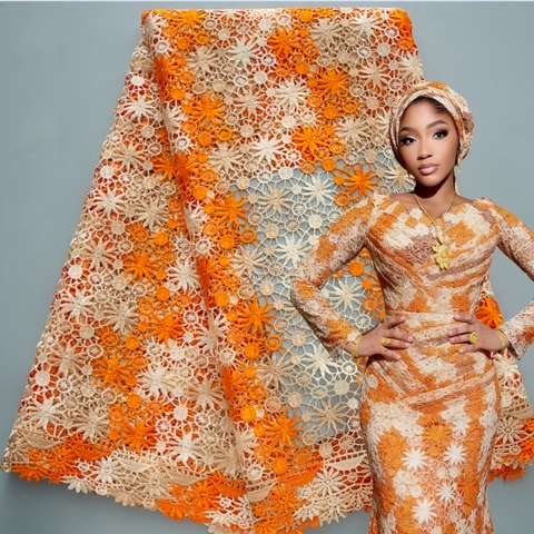 عرض رائع قماش دانتيل مطرز بحبل نقي ، حبل أفريقي ، ملابس دانتيل ، قماش زهور ، قماش جبير ، برتقالي ملوكي