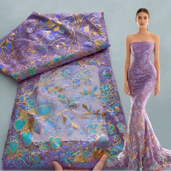 4565 Classic Africans Fabrics Gold Lilac Color Lace Fabric Flat Sequin Embroidery Fabric for Dress Evening Dress Stretch