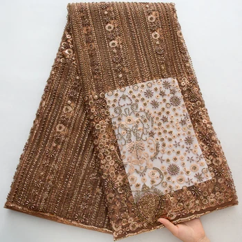 4554 Chocolate Brown Wholesale Price Sequins Flowers Lace Embroidery African Cord Beads Lace Fabric With Sequin for Bridal Dress