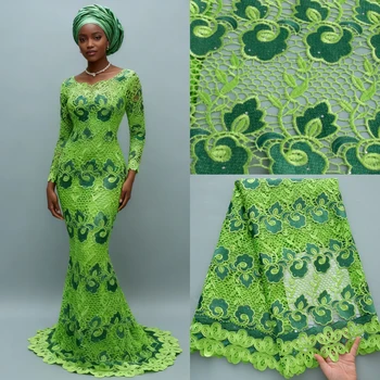 4549 African Lace with Sequins Luxury Nigerian French Mesh Fabric Green and Gold Leaf Pattern for Christmas Party Bridal Dress